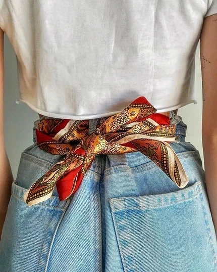 Скрути бандану в ленту и пропусти через шлевки или просто завяжи сбоку.