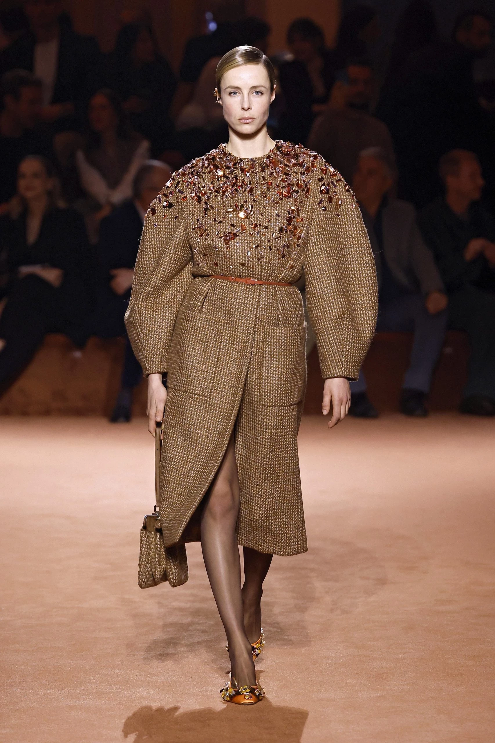 На фоне утилитарности дизайнеры делают ставку на нарядность. Пальто и куртки, украшенные пайетками, стразами и сложной вышивкой, становятся центральной деталью образа. Для повседневного стиля подойдут модели с умеренным количеством блестящих элементов — например, вышивкой на манжетах или воротнике. Главное правило: пусть сияющая вещь будет единственной «звездой» образа.