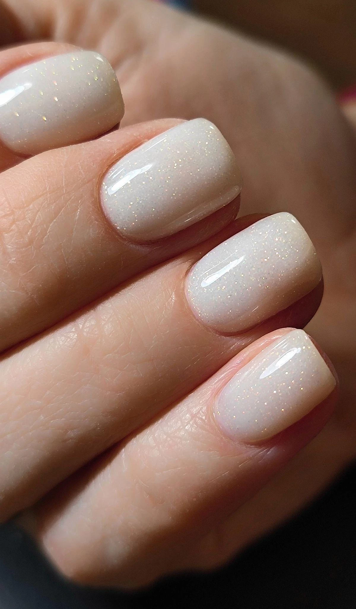 Классика, которая никогда не выйдет из моды. Молочная база визуально освежает руки, а мельчайшие блестки создают эффект влажного сияния. Для глубины можно использовать прозрачный гель с шиммером. Дополните один ноготь акцентом — крошечной жемчужиной или чуть более плотным блеском.
