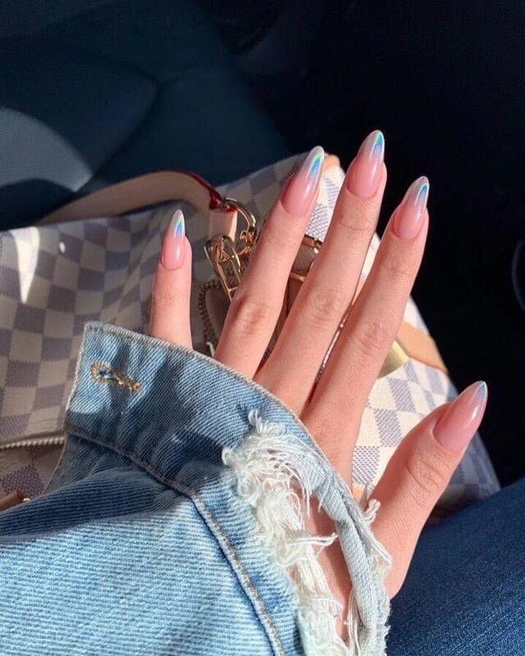 При дневном свете он выглядит спокойным и натуральным, а в лучах солнца или вечернего освещения оживает, переливаясь розовым, лавандовым и голубым. Эффект достигается с помощью тонкой втирки или топа с мягким голографическим пигментом.