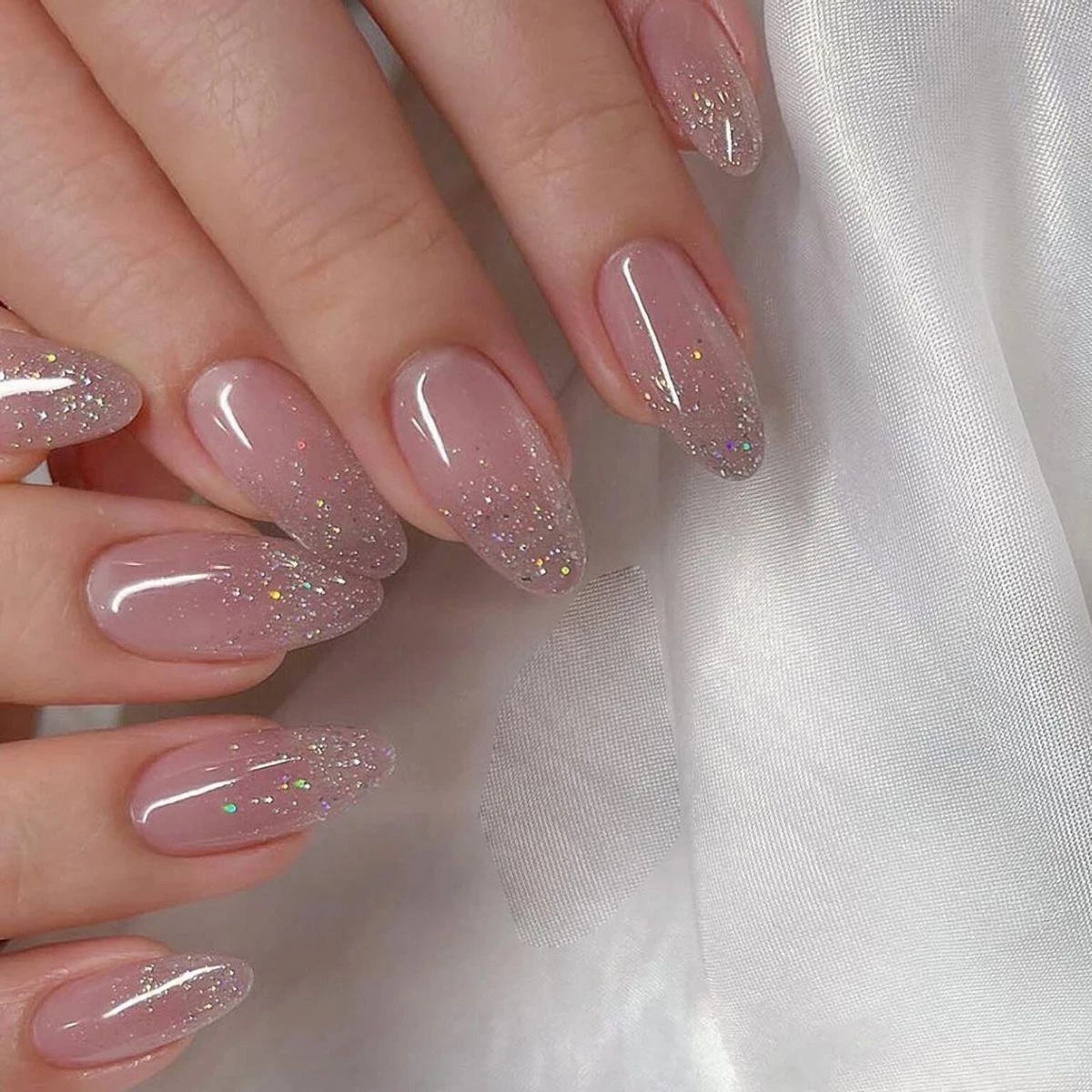 • Длина: короткие и средние ногти с блестящим нюдом выглядят гармонично. На длинных блестки могут перегружать образ.