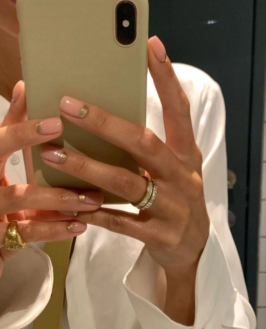 Теплая, универсальная база в тандеме с золотыми акцентами — это всегда выигрышный вариант. Золото может быть в виде фольги, мазков, тонких линий или растушеванного глиттера. Маникюр остается нейтральным, но при этом приобретает аристократичный блеск.