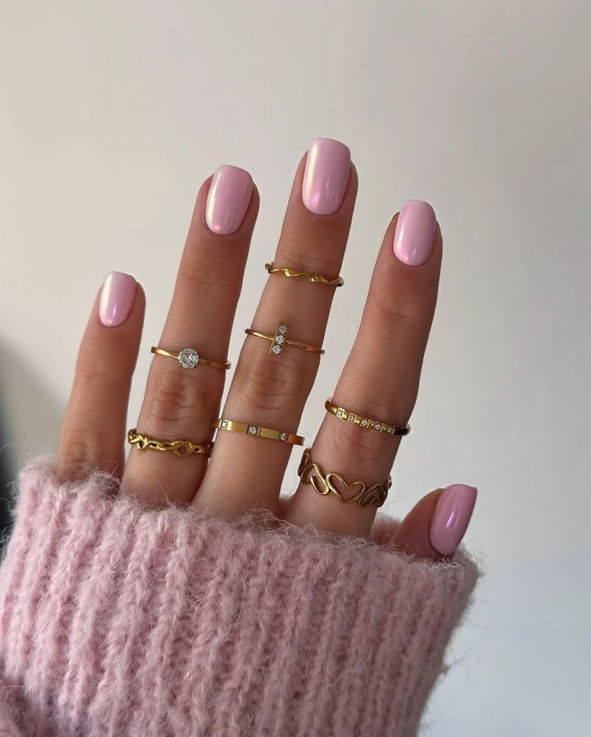 Перламутрово-розовый оттенок работает как хайлайтер для ногтей. Он самодостаточен, поэтому не требует дополнительных элементов. Смотрится свежо и нежно, подходит и под офисный дресс-код, и под романтичные образы.