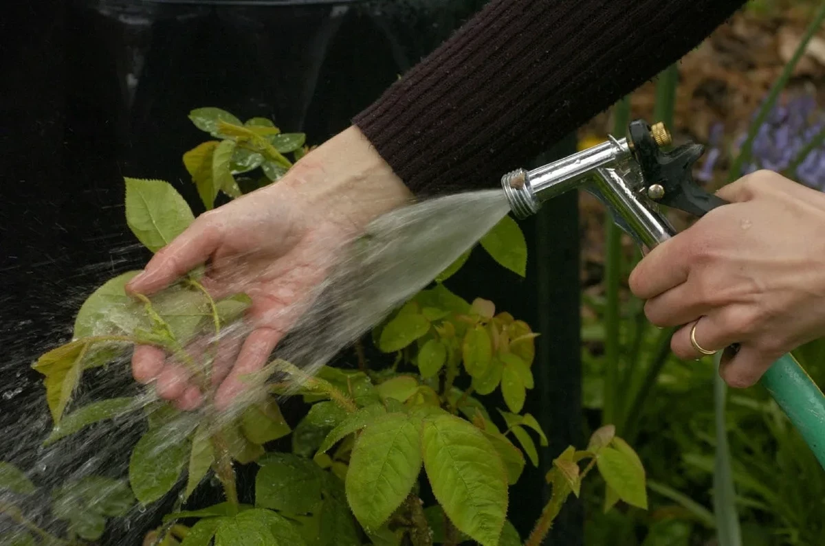 Простой и бесплатный способ — смыть тлю водой. Направьте струю из шланга на поражённые участки, чтобы сбить вредителей на землю. Лучше делать это утром, чтобы растения успели просохнуть за день.