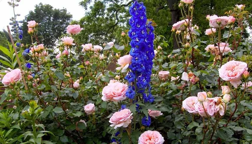 Если у вас в саду растут высокорослые розы, то дельфиниум станет отличным соседом. Это растение прекрасно дополняет высокие сорта роз, создавая красивую вертикаль в композиции. Дельфиниум не только добавляет яркости, но и имеет схожие требования к условиям — солнечные участки и плодородная почва. Его эффектные цветы гармонично смотрятся с розами, не затмевая их, а наоборот, подчеркивая красоту.