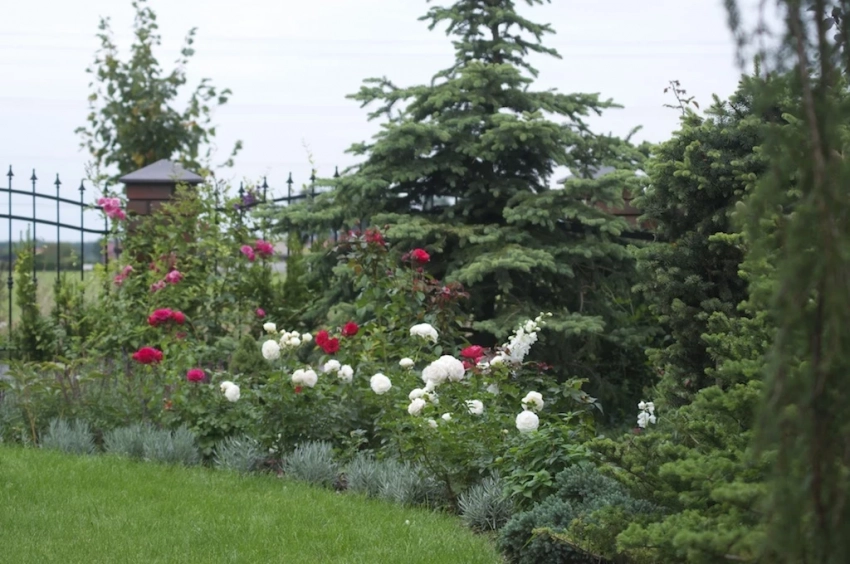 Декоративные кустарники — это отличные соседи для роз. Кипарис, можжевельник, туя, барбарис и дерен придают клумбе дополнительную глубину и текстуру, не затеняя при этом розы. Эти растения служат фоном, на котором розы выглядят еще более пышно и величественно. Кроме того, такие кустарники являются вечнозелеными, что помогает создать интересный вид даже в зимний период.