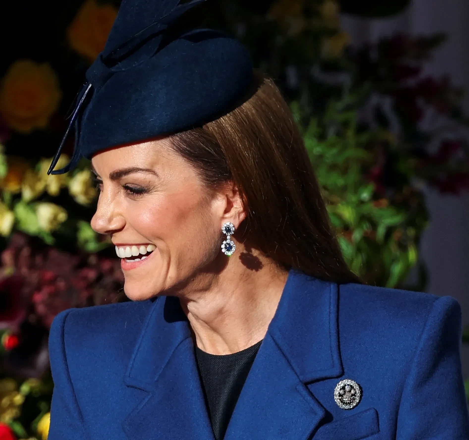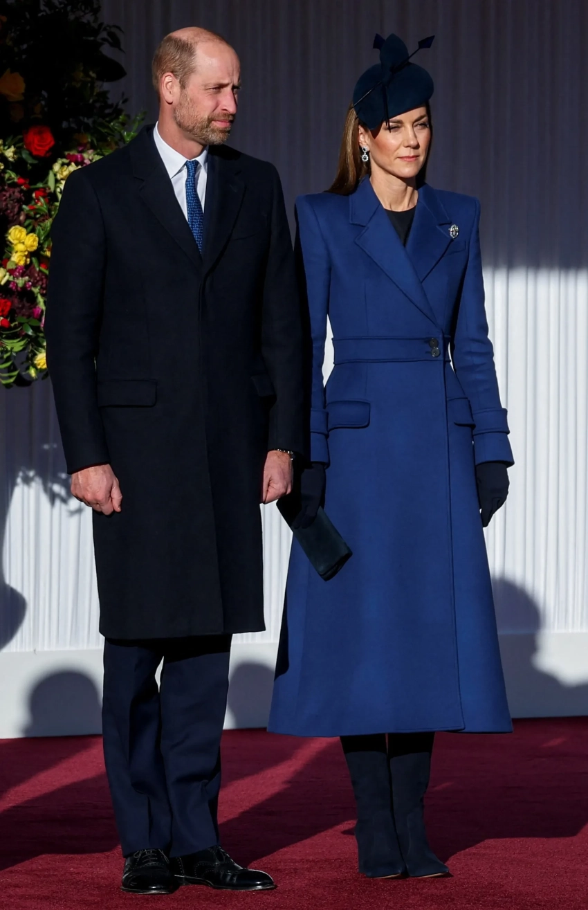 43-летняя Кейт Миддлтон появилась на приёме в синем пальто Alexander McQueen, серьгах принцессы Дианы и шляпе Juliette Millinery — в этом же образе она посетила рождественскую службу в 2023 году (это было последнее публичное появление принцессы перед месяцами затишья и до объявления о том, что у неё обнаружили рак).