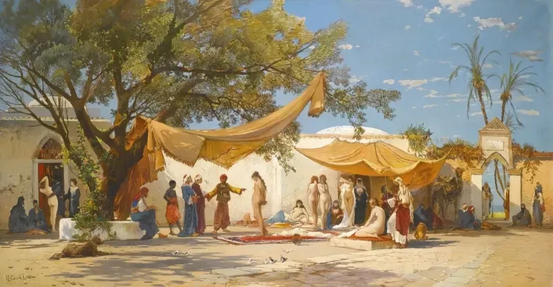 Картина Саломона Корроди «Невольничий рынок». Да, на ней изображена сцена не из времён Средневековья, но подобные картины вполне можно было встретить и в веке XIV-м